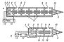 Рис. 1. Схемы конструкции пролётных клистронов: а — усилительного, б — генераторного: 1 — катод; 2 — фокусирующий цилиндр; 3 — электронный поток; 4 — входной объёмный резонатор; 5 — отверстие для ввода энергии сверхвысоких частот; 6 — зазор объёмного резонатора; 7 — пространство дрейфа; 8 — выходной объёмный резонатор; 9 — отверстие для вывода энергии сверхвысоких частот; 10 — коллектор, принимающий электронный поток; 11 — промежуточные объёмные резонаторы; 12 — источник постоянного анодного напряжения; 13 — источник напряжения подогрева катода; 14 — первый объёмный резонатор; 15 — щель связи, через которую часть энергии сверхвысоких частот проходит из второго резонатора в первый; 16 — второй объёмный резонатор.