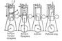 Схема работы двухтактного двигателя: 1 — выпускной клапан; 2 — форсунка; 3 — продувочный насос; 4 — продувочные (впускные) окна.