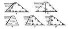 Типы каменных плотин: а, б — каменно-набросные; в — из каменной сухой кладки; г — полунабросная (с напорной частью из сухой кладки и низовой — из каменной наброски); д — набросная (с бетонной напорной стенкой).