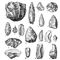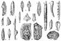 Мустьерская эпоха: 1 — леваллуазское ядрище; 2 — листовидное остриё; 3 — остриё тейяк; 4 — дисковидное ядрище; 5, 6 — остроконечники; 7 — двуконечное остриё; 8 — зубчатое орудие; 9 — скребок; 10 — рубило; 11 — нож с обушком; 12 — орудие с выемкой; 13 — проколка; 14 — скребло типа кина; 15 — двойное скребло; 16, 17 — скрёбла продольные.