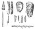 Мезолит: 1 — кремнёвое остриё: 2 — копалка из рога оленя; 3 — скребок; 4 — топор; 5 — костяной наконечник с каменными вставками; 6 — крючок из кости; 7 — геометрические микролиты; 8 — костяной гарпун.