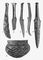 Предметы карасукской культуры: 1—4 — бронзовые ножи; 5 — бронзовый кинжал; 6 — глиняный сосуд.