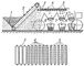 Схема картофелесортировки: 1 — приёмный бункер; 2 — загрузочный транспортёр; 3 — гладкие ролики; 4 — фигурные ролики для выделения мелких клубней; 5 — фигурные ролики для выделения средних клубней; 6 — выгрузной транспортёр для крупных клубней; 7 — выгрузной транспортёр для средних клубней; 8 — выгрузной транспортёр для мелких клубней.