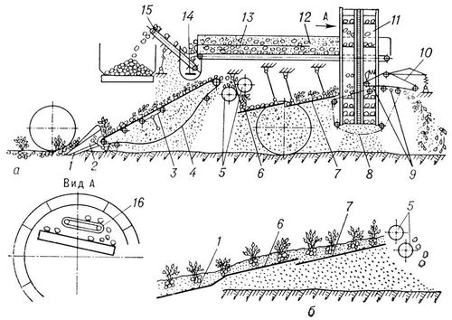 Схема рабочего процесса картофелеуборочного комбайна: а — элеваторной модификации; б — грохотной модификации; 1 — подкапывающий лемех; 2 — боковина; 3 — механизм принудительного встряхивания элеватора; 4 — основной элеватор; 5 — комкодавитель; 6 и 7 — решёта грохота; 8 — транспортёр ботвоудаляющего устройства; 9 — отбойные прутки; 10 — прижимной транспортёр; 11 — барабанный транспортёр; 12 — транспортёр-переборщик; 13 — делитель; 14 — транспортёр примесей; 15 — загрузочный элеватор; 16 — горка.