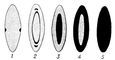 Схематическое изображение различных форм катаракты: 1 — передняя и задняя капсулярные катаракты; 2 — околоядерная слоистая катаракта; 3 — ядерная катаракта; 4 — корковая катаракта; 5 — полная катаракта.