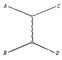 Приведём ещё один важный пример «обобщённых» диаграмм — так называемую «четырёххвостку» (рис. 11). Она изображает либо распад одной частицы на три (А ® В + С + D), если такой процесс энергетически разрешен, либо переходы типа «две частицы ® две частицы», в частности, если частицы в начале и в конце процесса одинаковы, — упругое рассеяние частиц. Рассмотрим этот последний процесс и, ради простоты, примем, что все частицы имеют одинаковую массу и нулевой спин. Тогда амплитуда рассеяния оказывается (если все 4 линии относятся к реальным частицам) зависящей лишь от двух инвариантных переменных. Обычно используются такие переменные: s = (pA + pB)2 — величина, равная квадрату энергии сталкивающихся частиц в системе центра инерции (т. е. в системе, в которой общий импульс частиц А и В равен нулю), и t = (pA+pC)2— величина, определяющая передачу импульса при рассеянии.