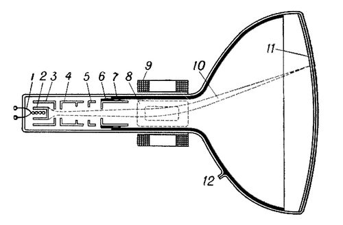 Рис. 1. Схематическое устройство кинескопа для черно-белого телевидения: 1 — нить подогревателя катода; 2 — катод; 3 — управляющий электрод; 4 — ускоряющий электрод; 5 — первый анод; 6 — второй анод; 7 — проводящее покрытие (акводаг); 8 — катушки вертикального отклонения луча; 9 — катушки горизонтального отклонения луча; 10 — электронный луч; 11 — экран; 12 — вывод второго анода.