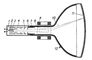 Рис. 2. Схематическое устройство цветного кинескопа с теневой маской типа 59ЛКЗЦ: 1 — экран; 2 — люминофорные точки (триады); 3 — мелкоструктурная цветоделительная маска; 4 — электронный прожектор; 5 — отклоняющая система; 6 — система радиального свечения; 7 — магнит чистоты цвета; 8 — магнит смещения луча.