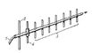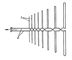 А. метровых и дециметровых волн. На метровых и дециметровых волнах для теле- и радиопередач применяют многоэтажные (до 30 этажей) турникетные (рис. 10), панельные, щелевые А. и другие типы А. с круговыми диаграммами направленности в горизонтальной плоскости и узкими в вертикальной плоскости (см. Телевизионная антенна). КНД этих А. пропорционален числу этажей и находится в пределах от 6 до нескольких десятков. Для увеличения зоны действия эти А. устанавливают на башнях или мачтах высотой 100—300 м и более. Самая высокая в мире телевизионная башня, высотой 533 м, сооружена в Москве. Приём телевизионных передач ведётся на симметричный вибратор, А. типа «волновой канал» (рис. 11) и др., которые обычно устанавливаются на крышах домов или высоких опорах. В больших (многоквартирных) домах применяют коллективную А., состоящую из собственно А., усилителя высокой частоты и системы распределительных фидеров, подводящих энергию высокой частоты с выхода усилителя к входам телевизоров. В качестве собственно А. в системе коллективного приёма применяют А. типа «волновой канал» и др. Число телевизоров, обслуживаемых одной коллективной А., доходит до нескольких сотен. Существенный вклад в разработку передающих и приёмных телевизионных А. внесли советские учёные Б. В. Брауде, В. Д. Кузнецов и др., зарубежные учёные: американец Н. Линденблад и др. На метровых волнах для связи в пределах прямой видимости применяют симметричный и несимметричный вибраторы, Бевереджа А. и др.; для ионосферной связи — синфазную многовибраторную решётку, А. типа «волновой канал», ромбическую А. и др.; для Метеорной радиосвязи — преимущественно А. типа «волновой канал».