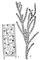 Кладофора: 1 — строение клетки — хлоропласт в виде продырявленной пластинки, в нём пиреноиды (двойные светлые кружки) и ядра (более крупные кружки с темноокрашенным ядрышком); 2 — нить с зооспорангиями (тёмные).