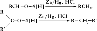 Клемменсена реакция, замена атома кислорода альдегидной или кетонной группы двумя атомами водорода при действии амальгамированного цинка и соляной кислоты: