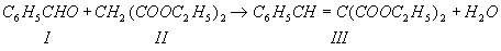 Кневенагеля реакция, конденсация альдегидов или кетонов с соединениями, содержащими активную метиленовую группу, в присутствии оснований с образованием производных этилена. Например, при конденсации бензойного альдегида (1) с диэтиловым эфиром малоновой кислоты (II) в присутствии пиперидина получается производное коричной кислоты (III):