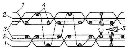 Рис. 3. Структура двухполотенных ковров: 1 — коренная основа; 2 — настилочная основа; 3 — ворсовая основа; 4 — нити утка; 5 — нож.