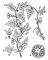 Колоквинт, побег с цветками; а — продольный разрез пестичного цветка; б — развёрнутый тычиночный цветок; в — поперечный разрез плода.
