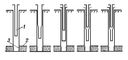Схема колонной подвески: а — однорядная; б — однорядная ступенчатая; в — двухрядная; г — двухрядная со ступенчатым первым рядом труб; д — двухрядная со ступенчатым первым и вторым рядом труб; 1 — колонная подвеска; 2 — пласт; 3 — отверстия (перфорация).