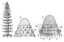 Конус нарастания: 1 — внешний вид верхушки побега водяной сосенки; 2, 3 — конус нарастания её стебля с поверхности и в разрезе; зл — зачатки листьев; ир — зоны интеркалярного роста; т — туника; к — корпус.