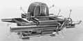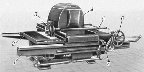 Копировальномножительная машина М 100 kh (ГДР): 1 — станина; 2 — стол (талер); 3 и 6 — маховички для продольного и поперечного перемещений каретки и осветителя; 4 — осветительное устройство; 5 — каретка; 7 — индикатор.