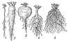 Рис. 4. Различные формы корней и типы корневой системы: 1, 4 — стержневая; 5 — мочковатая; 2, 3 — корнеплоды (моркови и свёклы).