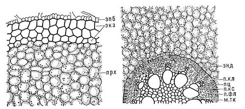 Рис. 2. Поперечный срез корня касатика в зоне проведения: слева — эпб — эпиблема, экз — экзодерма, прх — запасающая паренхима первичной коры; справа — энд — эндодерма, пкл — пропускная клетка, пц — перицикл, пкс — первичная ксилема, п. фл — первичная флоэма, м. тк — механическая ткань.
