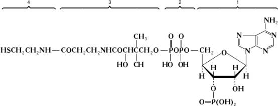 Кофермент А, КоА, кофермент ацетилирования (или ацилирования), важнейший из коферментов, принимающий участие в реакциях переноса ацильных групп. Молекула КоА состоит из остатка адениловой кислоты (1), связанной пирофосфатной группой (2) с остатком пантотеновой кислоты (3), которая, в свою очередь, соединена пептидной связью с остатком b-меркаптоэтаноламина (4); см. формулу.