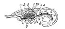 Рис. 1. Схема кровеносной системы речного рака: 1 — сердце; 2 — головная аорта; 3 — сяжковая артерия; 4 — задняя аорта; 5 — нисходящая артерия; 6 — грудная артерия; 7 — брюшной синус; 8 — капилляры жабр; 9 — выносящие каналы жабр; 10 — околосердечная полость.