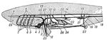 Рис. 2. Схема кровеносной системы рыбы: 1 — венозный синус; 2 — предсердие; 3 — желудочек; 4 — артериальный конус; 5 — брюшная аорта; 6 — приносящие жаберные артерии; 7 — жаберные щели; 8 — выносящие жаберные артерии; 9 — сонная артерия; 10 — спинная аорта; 11 — подключичная артерия; 12 — чревная артерия; 13 — брыжеечная артерия; 14 — половая артерия; 15 — почечная артерия; 16 — подвздошная артерия; 17 — хвостовая артерия; 18 — хвостовая вена; 19 — приносящая вена воротной системы почек; 20 — задняя кардинальная вена; 21 — воротная система почек; 22 — половая вена; 23 — подвздошная вена; 24 — боковая вена; 25 — подключичная вена; 26 — приносящая вена воротной системы печени; 27 — печёночная вена; 28 — кювьеров проток; 29 — передняя кардинальная вена.