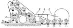 Технологическая схема работы арахисоуборочной машины: 1 — нож; 2 — прутковый транспортёр; 3 — поперечный транспортёр; 4 — карданная передача от трактора.