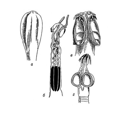 Рис. 2. Формы головок ленточных червей: а — с прикрепительными бороздами; б — с 4 выдвижными хоботками, усаженными крючьями; в — с присосками, присасывательными лопастями и крючьями; г — с присосками, одним хоботком и крючьями.