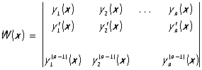 где C1, C2,..., Cn — произвольные постоянные и y1(x), у2(х),..., yn(x) — линейно независимые (см. Линейная зависимость) частные решения, образующие т. н. фундаментальную систему решений. Критерием линейной независимости решений служит неравенство нулю (хотя бы в одной точке) определителя Вроньского (вронскиана):