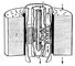 Рис. 3. Схематический разрез водоохлаждаемого соленоида на 250 кгс (движение воды показано стрелками), 1-я секция имеет массу 2 кг, потребляет мощность 0,4 Мвт и создаёт поле Bmax ~ 45 кгс, 2-я секция — 16 кг, 2 Мвт и 65 кгс, 3-я секция — 1250 кг, 12 Мвт и 140 кгс.