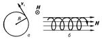 Для того чтобы быть М. л., магнитное поле должно удовлетворять определённым условиям. Известно, что оно действует только на движущиеся заряженные частицы. Скорость частицы v в любой точке всегда можно представить в виде геометрической суммы двух составляющих — v^, перпендикулярной к напряжённости Н магнитного поля в этой точке, и v||, совпадающей по направлению с Н. Сила F воздействия поля на частицу, так называемая Лоренца сила, определяется только v^ и не зависит от v||. В СГС системе единиц F по абсолютной величине равна v^H, где c — скорость света, е — заряд частицы. Сила Лоренца всегда направлена под прямым углом как к v^, так и к v|| и не изменяет абсолютных величины скорости частицы, однако меняет направление этой скорости, искривляя траекторию частицы. Наиболее простым является движение частицы в однородном магнитном поле (Н повсюду одинакова по величине и направлению). Если скорость частицы направлена поперёк такого поля (v = v^), то её траекторией будет окружность радиуса R (рис. 1, а). Сила Лоренца в этом случае играет роль центростремительной силы (равной mv2^ / R, m — масса частицы), что даёт возможность выразить R через v^ и Н : R = v^ / wн, где wн = eH / mc. Окружность, по которой движется заряженная частица в однородном магнитном поле, называется ларморовской окружностью, её радиус — ларморовским радиусом (Rл), а wн — ларморовской частотой. Если скорость частицы направлена к полю под углом, отличающимся от прямого, то, кроме v^, частица обладает и v||. Ларморовское вращение при этом сохранится, но к нему добавится равномерное движение вдоль магнитного поля, так что результирующая траектория будет винтовой линией (рис. 1, б).