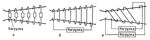 Рис. 2. Схемы соединения электродов в МГД-генераторах: а — линейный фарадеевский генератор с секционированными электродами; б — линейный холловский генератор; в — сериесный генератор с диагональным соединением электродов.