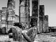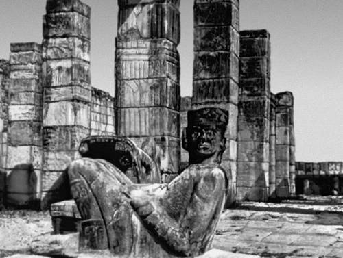 Каменная статуя и фрагмент колоннады «Храма воинов» в Чичен-Ице. 9—12 вв.