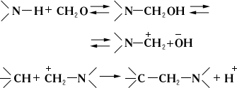 Механизм М. р. сводится, по-видимому, к образованию аминометильного катиона, который атакует атом углерода, несущий частичный отрицательный заряд (электрофильное замещение):