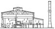 Мартеновский цех. По способу подачи шихтовых материалов различают цехи с рельсовой подачей шихты и цехи с крановой подачей шихты. Основная масса мартеновской стали производится в цехах с рельсовой подачей шихты. В состав современного мартеновского цеха входят следующие отделения: шихтовый двор, миксерное отделение, гл. здание, отделение раздевания слитков, отделение подготовки изложниц. Шихтовый двор служит для приёмки и хранения поступающих в мартеновский цех твёрдых шихтовых и заправочных материалов. Для разгрузки и погрузки материалов на шихтовых дворах установлены мостовые магнитные и грейферные краны. К печам шихта передаётся в мульдах, устанавливаемых на железнодорожных тележках. В миксерном отделении, которое, как правило, примыкает с торца к главному зданию мартеновского цеха, устанавливаются один или два миксера, предназначенных для хранения жидкого чугуна, поступающего из доменного цеха. К мартеновским печам чугун из миксера подаётся по железнодорожному пути в чугуновозных ковшах. На заводах, где нет миксерного отделения, чугун из доменного цеха поступает к мартеновским печам в ковшах миксерного типа. Главное здание цеха (см. рис.) состоит из шихтового открылка, печного и разливочного пролётов. Шихтовый открылок, расположенный на уровне пола рабочей площадки печей, примыкает к печному пролёту и служит для подачи шихтовых материалов к печам. В печном пролёте размещаются мартеновские печи и пульты управления ими. Печи располагаются в одну линию вдоль центральных колонн главного здания; со стороны шихтового открылка размещаются пульты управления. Рабочая площадка печного пролёта устраивается на уровне 6—7 м от заводского пола. На рабочей площадке обычно проложены 3 железнодорожных пути: для подачи к печам мульдовых составов с шихтой, для передвижения напольной завалочной машины, для подачи к печам чугуновозных ковшей с жидким чугуном из миксерного отделения. Для заливки чугуна в печи в пролёте имеются мостовые заливочные краны. Разливочный пролёт примыкает непосредственно к печному. Его главное назначение — приёмка стали из печей, разливка её по изложницам или на установках непрерывной разливки и уборка технологического шлака. С одной стороны разливочного пролёта располагаются мартеновские печи, с другой — вдоль стен находятся разливочные площадки (в случае разливки стали по изложницам). Обычно в разливочном пролёте проложено несколько железнодорожных путей: для составов с изложницами, для обслуживания операций по уборке шлака и мусора и т. п. В разливочном пролёте имеются также стенды для сталеразливочных ковшей, стенды для шлаковых чаш, сушилки для стопоров, ямы для ремонта ковшей. В пролёте установлены мостовые разливочные краны (для разливки стали) и консольно-поворотные краны (для обслуживания разливки и сталевыпускных желобов). Отделение раздевания слитков (так называемое стрипперное отделение) располагается, как правило, в самостоятельном здании около отделения нагревательных колодцев блюминга или слябинга. Здесь слитки извлекаются из изложниц (см. Стрипперование слитков). Отделение подготовки изложниц (двор изложниц) предназначено для сборки составов с изложницами под разливку стали; обычно располагается недалеко от разливочного пролёта. В отделении подготовки изложниц проложено 
