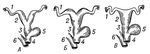 Различные типы матки у плацентарных млекопитающих: А — двойная матка, Б — двурогая матка, В — простая матка; 1 — яйцевод, 2 — матка, 3 — влагалище, 4 — мочеполовой синус, 5 — мочевой пузырь, 6 — прямая кишка.