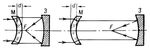 Рис. 1. Оптические схемы простейших менисковых систем, в которых отсутствует хроматическая аберрация и возможно исправление сферической аберрации, комы и астигматизма. М — ахроматический мениск; З — вогнутое сферическое зеркало; F — фокус системы.