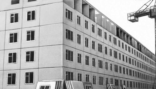 Строительство пятиэтажного жилого дома из асбестоцементных панелей.
