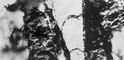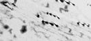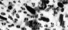 Рис. 3. Микроструктура сплава железа с хромом и никелем, наблюдаемая с помощью электронного микроскопа. Крупные тёмные выделения образовались при высокой температуре. Мелкие выделения, возникшие при низкой температуре, не видны, но обнаруживаются благодаря вызванным ими искажениям решётки (область искажений имеет вид кофейного зерна).