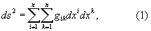 где x1, x2,..., xn — координаты, gik — некоторые функции координат. Совокупность величин gik образует тензор второго ранга, который и называется М. т. Этот тензор симметричен, т. е. gik = gki. Вид компонент М. т. gik зависит от выбора системы координат, однако ds2 не меняется при переходе от одной координатной системы к другой, т. е. является инвариантом относительно преобразований координат. Если выбором системы координат можно привести М. т. к виду