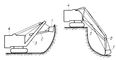 Механическая лопата: а — прямая; б — обратная; 1 — ковш; 2 — рукоять; 3 — стрела; 4 — кузов.