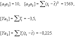 поэтому ai1 = 1, ai2 = ti - t (согласно предположению о равноточности наблюдений, все pi = 1). Так как