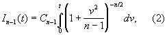 где постоянная Cn-1 выбрана таким образом, чтобы выполнялось условие: In-1(¥) = 1. При больших n формулу (2) можно заменить формулой (1). Однако применение формулы (1) при небольших n привело бы к грубым ошибкам. Так, например, согласно (1), значению I = 0,99 соответствует t = 2,58; истинные значения t, определяемые при малых n как решения соответствующих уравнений ln-1(t) = 0,99, приведены в таблице: