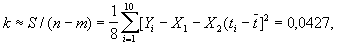 где k — неизвестная дисперсия на единицу веса (в данном случае k — дисперсия любой из величин Yi). Так как в этом примере компоненты решения принимают значения X1 = -0,35 и X2 = -0,00524, то