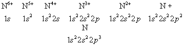 (число электронов в данной оболочке указывается индексом справа сверху). Такие же электронные конфигурации, как и ионы азота, имеют нейтральные атомы последовательных элементов в периодической системе, обладающие тем же числом электронов: Н, Не, Li, Be, В, С (Z = 1,2,3,4,5,6). Периодичность в свойствах элементов определяется сходством внешних электронных оболочек А. Например, нейтральные А. Р, As, Sb, Bi (Z = 15, 33, 51, 83) имеют по три р-электрона во внешней электронной оболочке подобно А. N и схожи с ним по химическим и многим физическим свойствам.