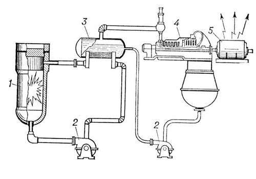 Рис. 2. Принципиальная схема АЭС: 1 — ядерный реактор; 2 — циркуляционный насос; 3 — теплообменник; 4 — турбина; 5 — генератор электрического тока.
