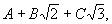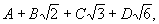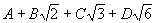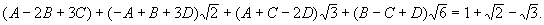 Но такое равенство возможно лишь в случае, когда равны между собой рациональные слагаемые обеих частей и коэффициенты при одинаковых радикалах. Т. о., получаются четыре уравнения для нахождения неизвестных коэффициентов А, В, С и D: А - 2B + 3C = 1, —А + В + 3D = 1, A + C - 2D = —1, В - С + D = 0, откуда A = 0, В = —1/2, С = 0, D = 1/2, т. е.