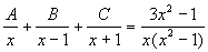 Так как последнее равенство должно выполняться для всех значений х, то коэффициенты при одинаковых степенях х справа и слева должны быть одинаковыми. Т. о., получаются три уравнения для определения трёх неизвестных коэффициентов: А + В + С = 3, В - С = 0, А = 1, откуда А = В = С = 1. Следовательно,