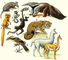 Характерные животные Неотропической области: 1 — девятипоясный броненосец; 2 — розалия; 3 — обыкновенная игрунка; 4 — чёрная коата; 5 — большой муравьед; 6 — ягуар; 7 — колибри сапфо; 8 — гоацин; 9 — лама; 10 — викунья.