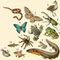 Характерные животные Неотропической области: 1 — тамандуа; 2 — трёхпалый ленивец; 3 — четырёхглазый опоссум; 4 — щелезуб; 5 — плавун; 6 — большой кровосос; 7 — белохвостый пампасовый олень; 8 — водосвинка; 9 — пуду; 10 — вискаша; 11 — цепкохвостый дикобраз; 12 — равнинный тапир; 13 — агути; 14 — кетцаль; 15 — шиншилла; 16 — хохлатая паламедея.